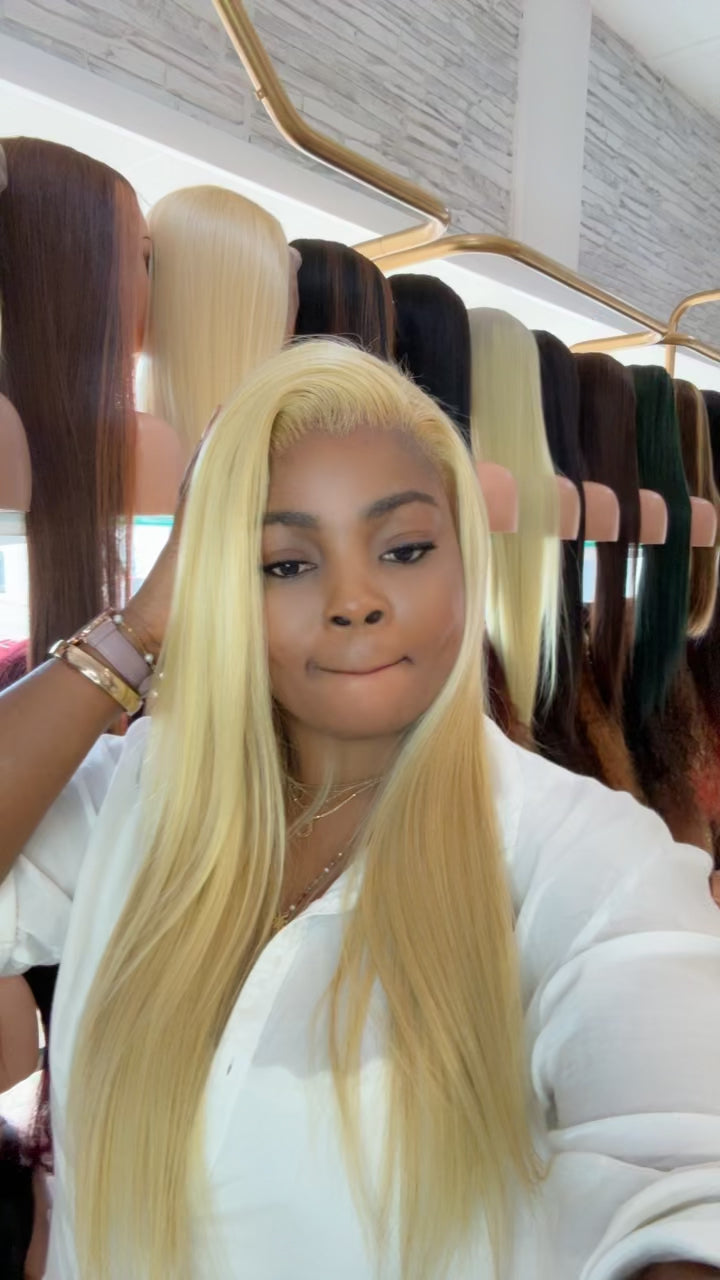 Le modèle porte une perruque : une frange closure 13x4 longueur disponible 22